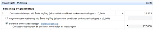 När du har fyllt i dina uppgifter i beräkningshjälpen och väljer att spara, beräknas omkostnadsbeloppet automatiskt, och det mest fördelaktiga omkostnadsbeloppet enligt den regel som det högst möjliga omkostnadsbeloppet är beräknat presenteras för dig. Dessa uppgifter överförs sedan automatiskt till avsnittet Huvudregeln-Utdelning och i punkt 2.1 beräknas "Omkostnadsbelopp vid årets ingång (alternativt omräknat omkostnadsbelopp) x 10,96 procent" automatiskt.