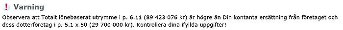 Här fyller du i den sammanlagda kontanta ersättning som betalats ut av företaget och dess dotterföretag under 2023. Inte heller här ska du ta med obeskattade kostnadsersättningar, skattepliktiga förmåner eller belopp som beskattats i tjänst på grund av fåmansreglerna om beskattning av utdelning och vinst i inkomstslaget tjänst. Ersättningar som täcks av statliga lönebidrag ska räknas med. Din egen kontanta ersättning som du fyllde i punkt 5.1 ska också med i punkt 5.2. När du klickar på "Kontrollera" beräknas resultatet i punkt 5.3 automatiskt.