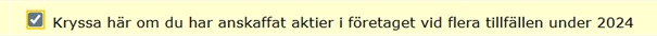 Om du har anskaffat aktier i företaget vid flera tillfällen under 2024 kryssar du i rutan eftersom punkterna 6.8 -6.11 beräknas automatiskt. Då kan du själv beräkna det lönebaserade utrymmet för aktierna som anskaffats under 2024 för varje anskaffningstillfälle och därefter summera beloppen och fylla i totalbeloppet för dessa aktier i punkterna 6.6 och 6.7. Dessa rutor är annars låsta och går inte att fylla i.