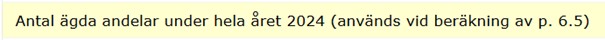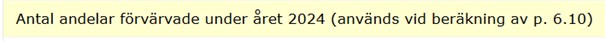 För aktier förvärvade under året får du bara räkna med ersättningar som betalats ut under den del av 2024 som aktierna ägts. I punkterna 6.1 - 6.5 räknar du ut det lönebaserade utrymmet för de aktier du ägt hela året. I punkterna 6.6 - 6.10 räknar du lönebaserat utrymme för de aktier du anskaffat under 2024, dessa punkter visas bara om du har fyllt i "Antal andelar förvärvade under året 2024" (används vid beräkning av punkt 6.10)” under avsnittet "Allmänna uppgifter".